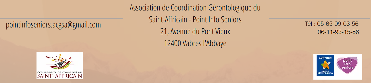 Le CCAS a souhaité adhérer à l’Association Gérontologique du St-Affricain (ACGSA), qui porte le dispositif Point Info Séniors mis en place et soutenu par le Conseil Départemental de l’Aveyron.